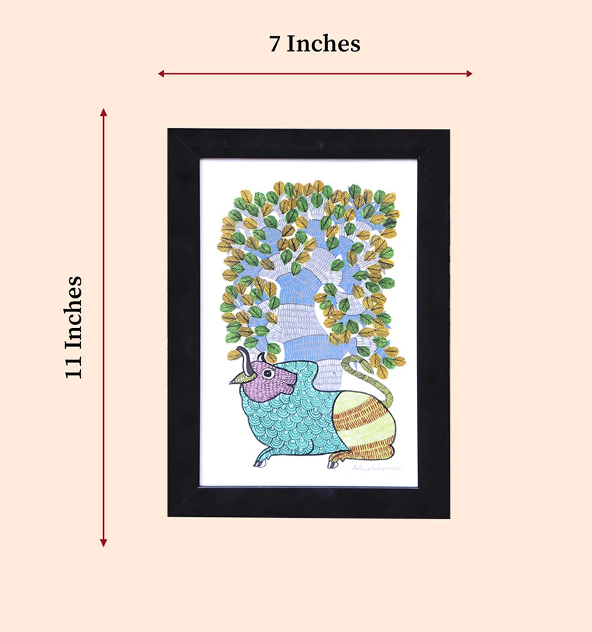Handpainted Cow Gond Tribal artwork with usual traditional painting designs, unique patterns, and vivid colors. Made by talented Gond artists, it is the ideal match to both modern and ethnic home & office décor. The basis of Gond art is the Gonds’ belief that a positive image brings happiness. They paint their homes with traditional tribal art and designs in an effort to ward off evil and bring luck into their lives.